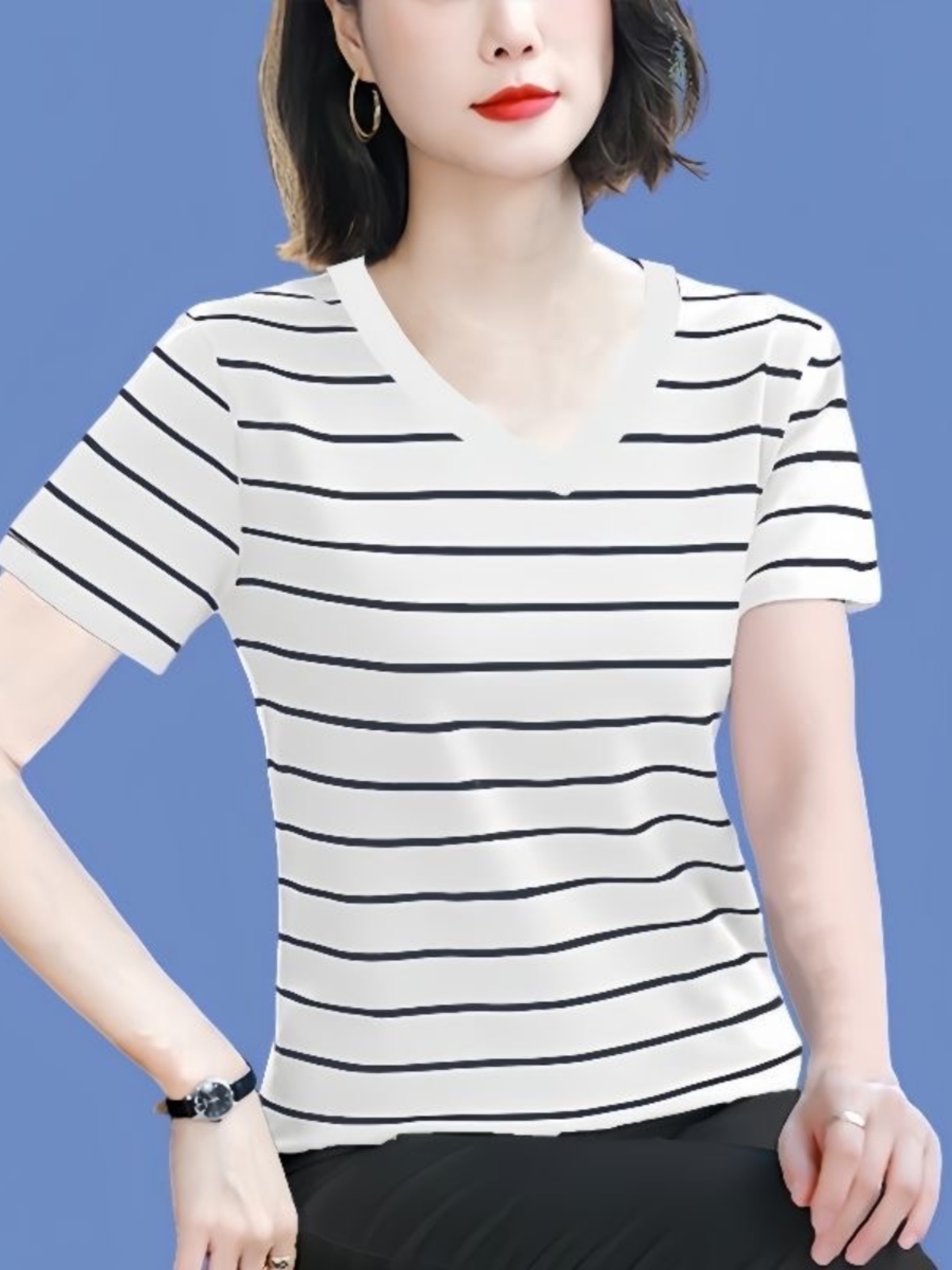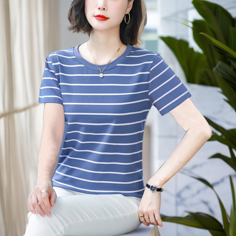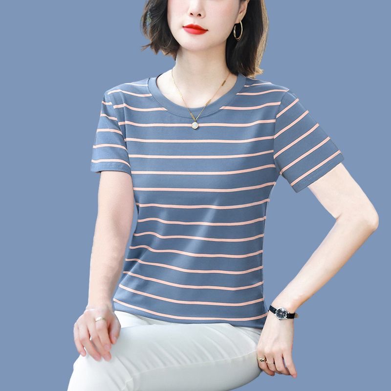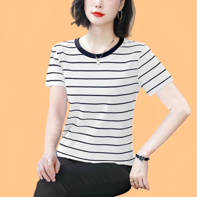 纯棉短袖t恤女士2025夏新款妈妈款洋气高贵小衫宽松大码条纹上衣