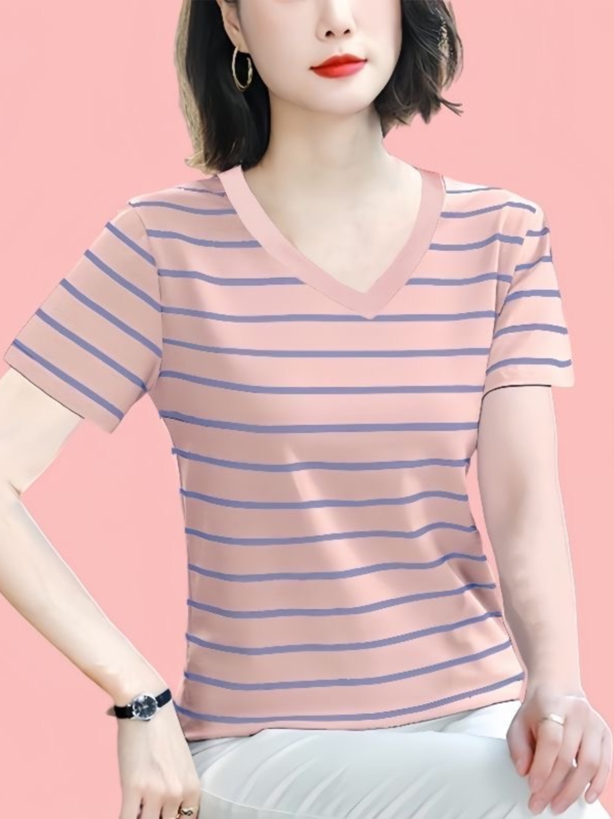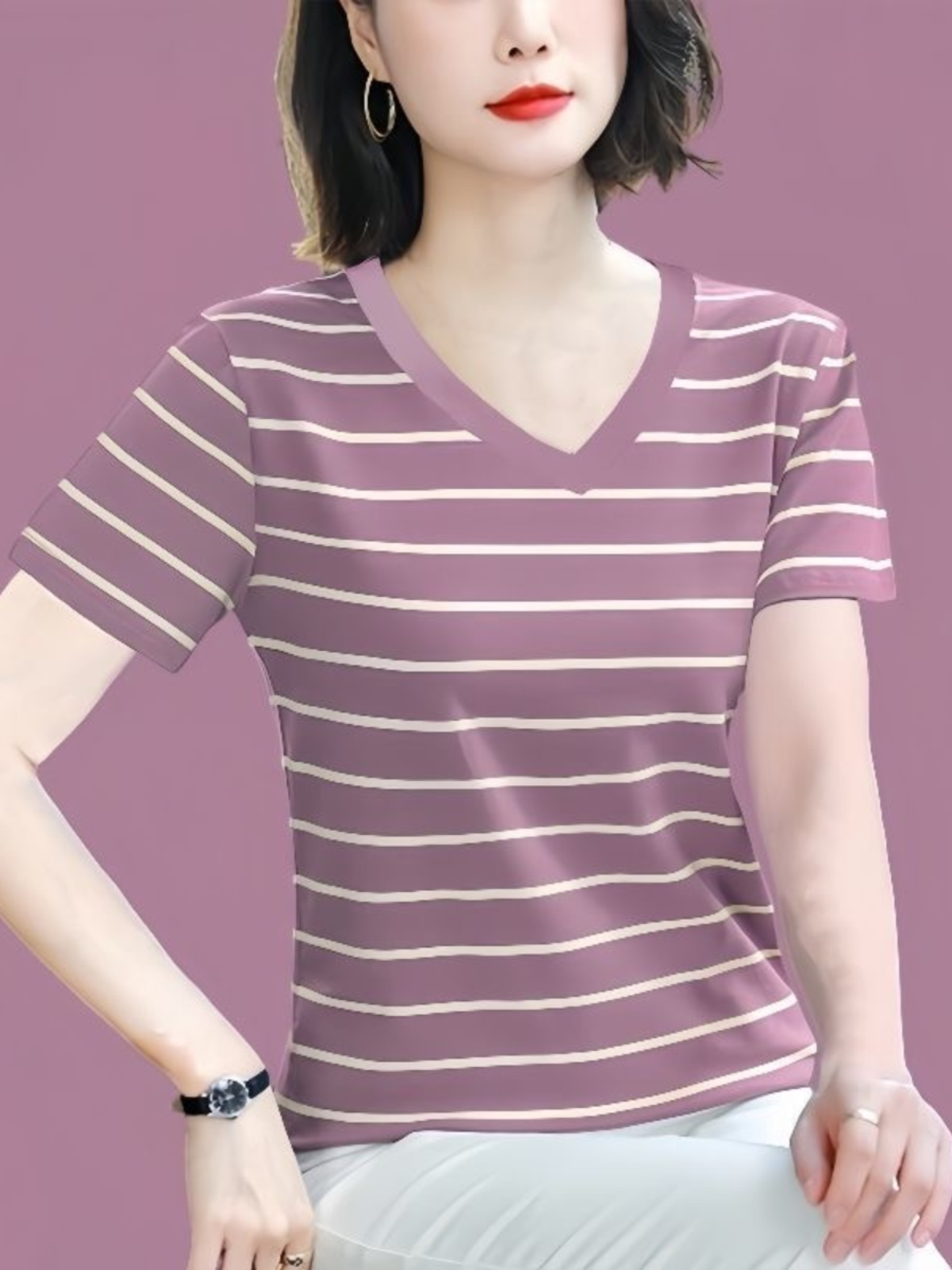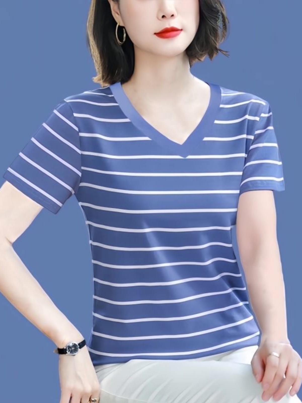 纯棉短袖t恤女士2025夏新款妈妈款洋气高贵小衫宽松大码条纹上衣