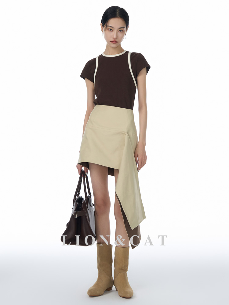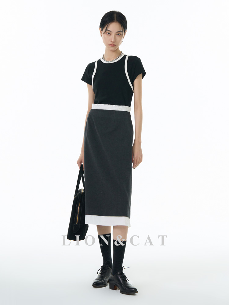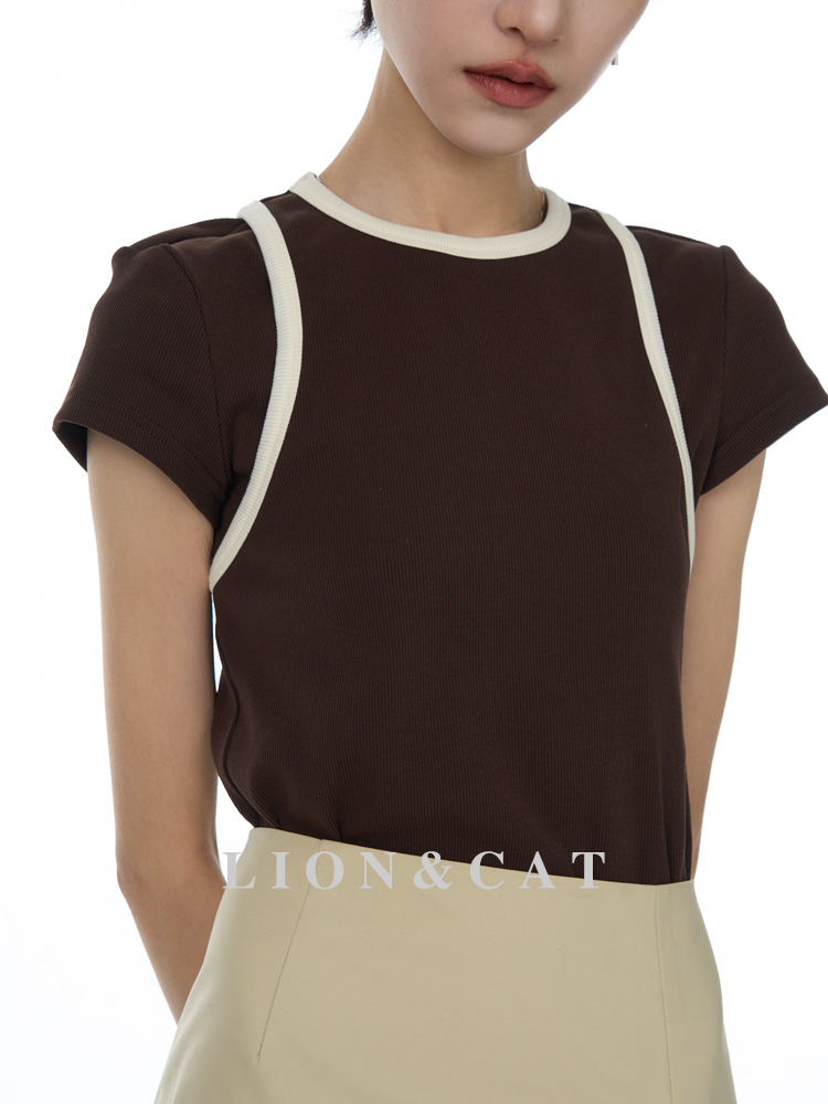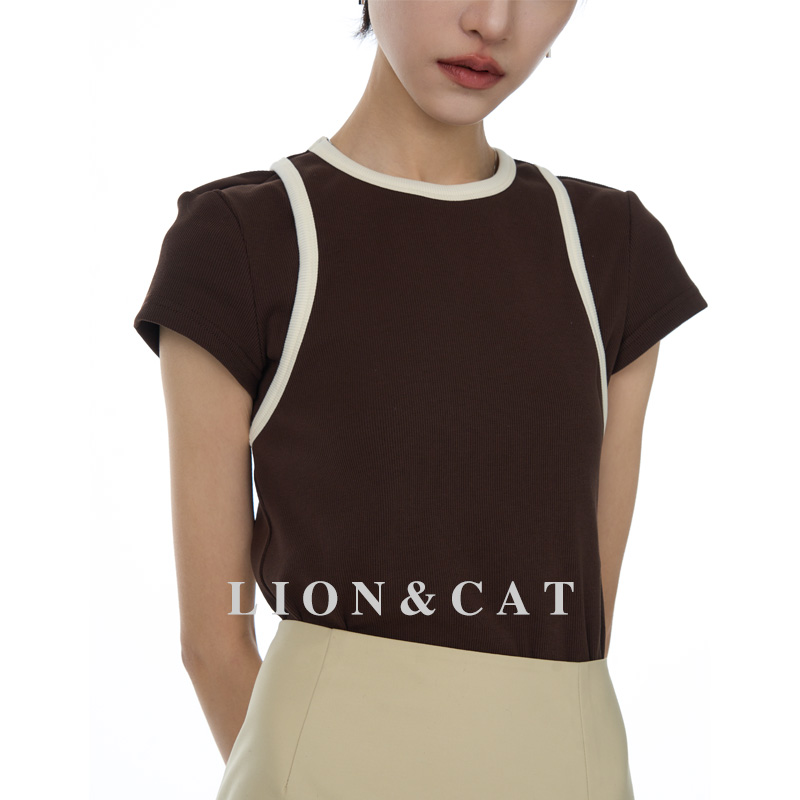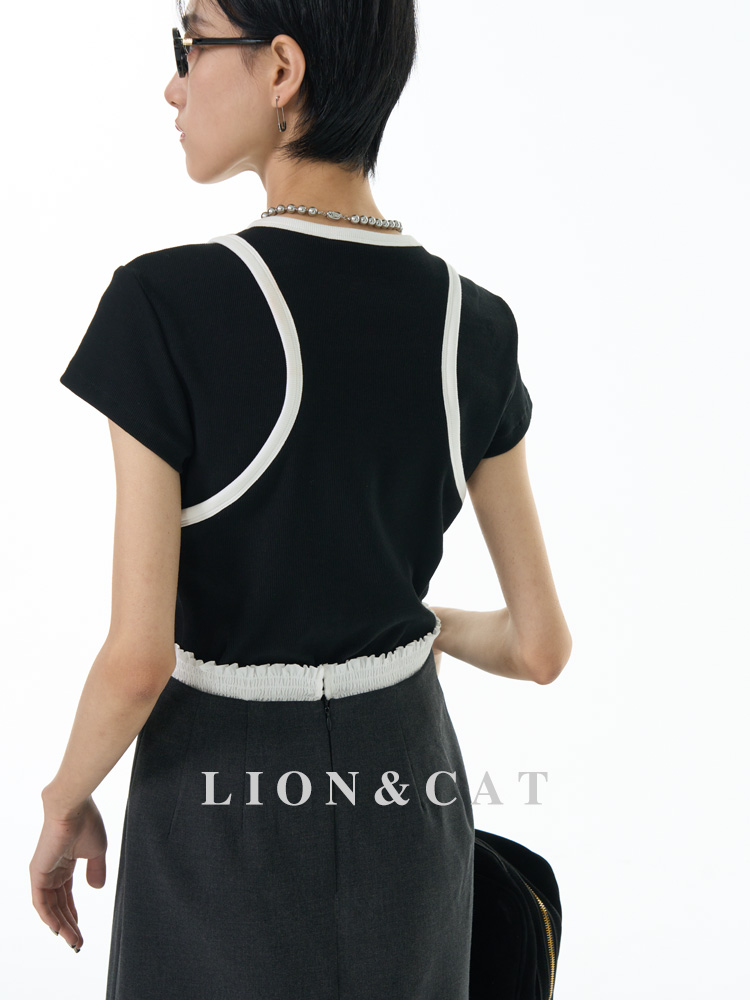 LIONCAT好穿推荐/复古时尚设计撞色假两件短袖T恤女短款百搭显瘦