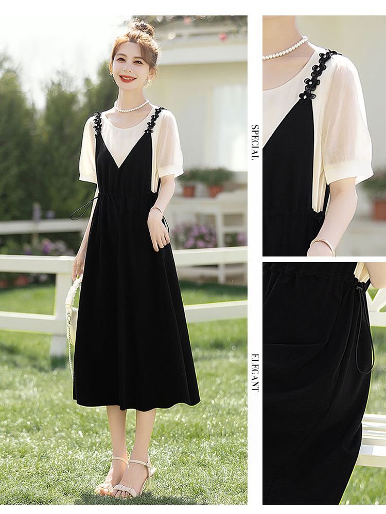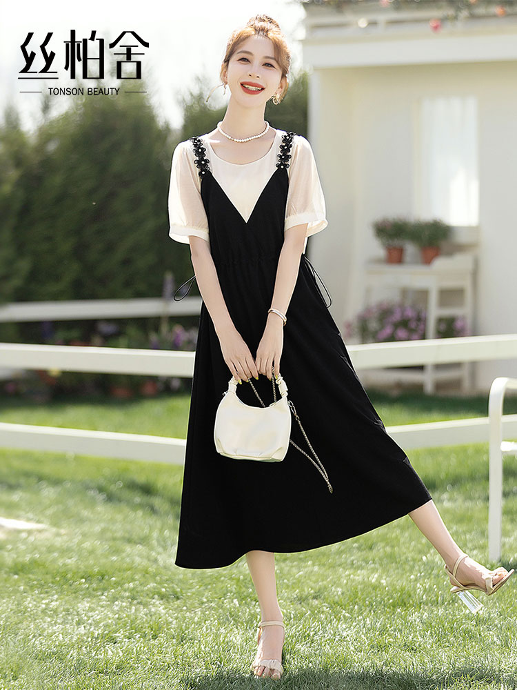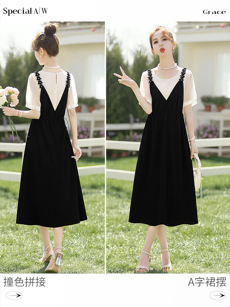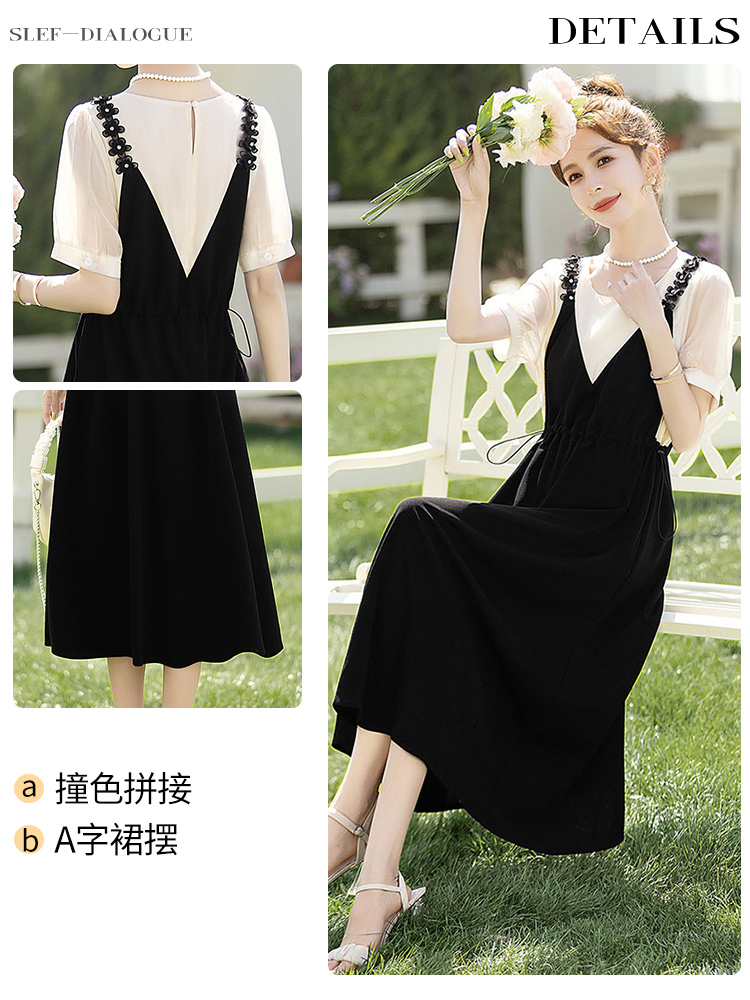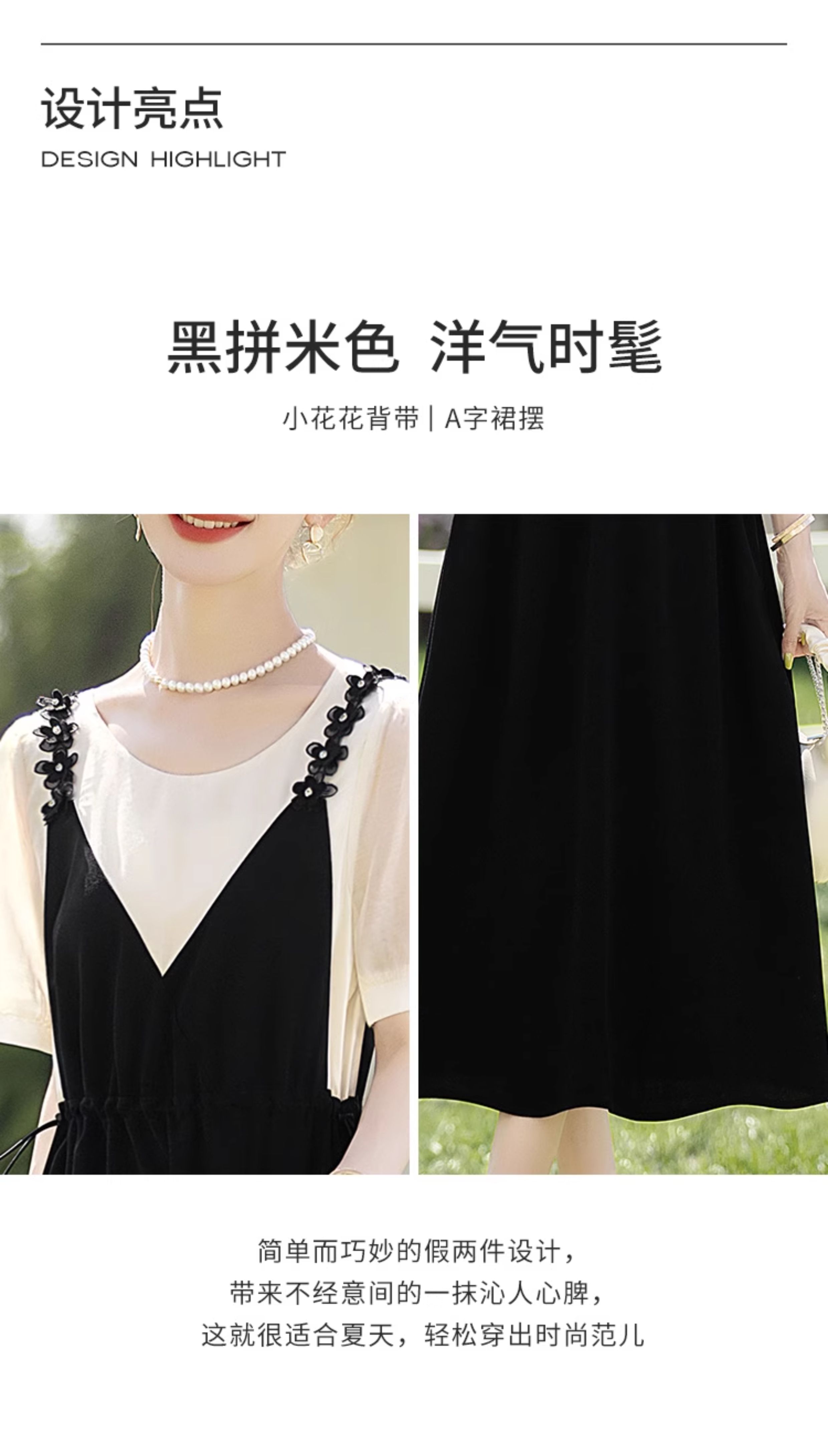 丝柏舍假两件连衣裙2025夏装新款女装圆领短袖撞色中长款A字裙