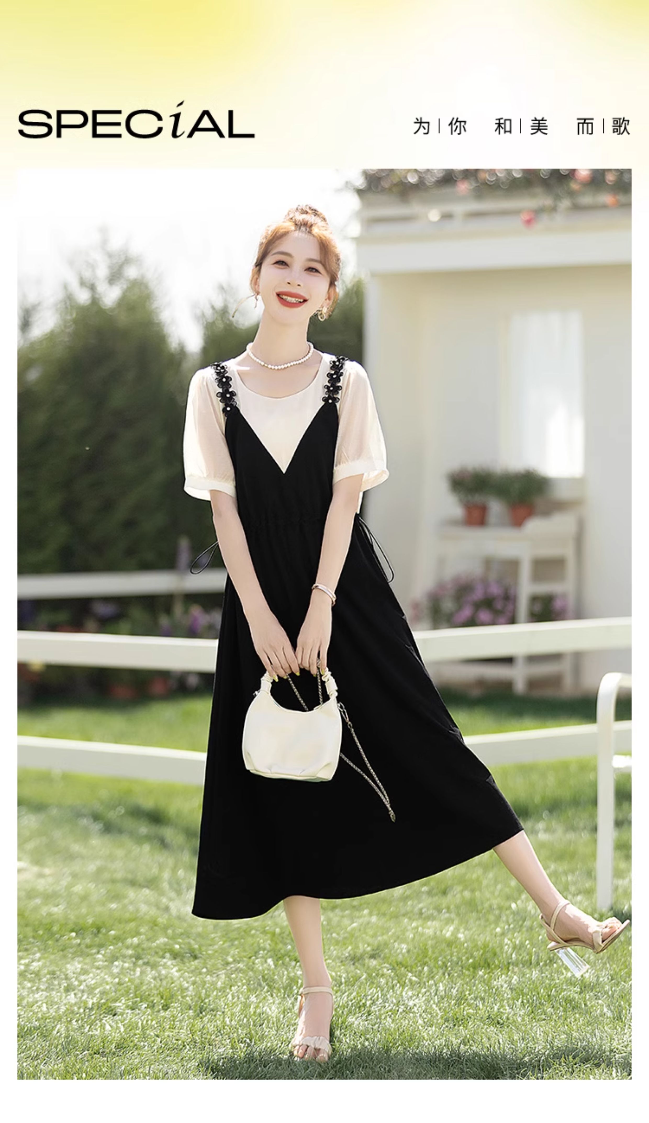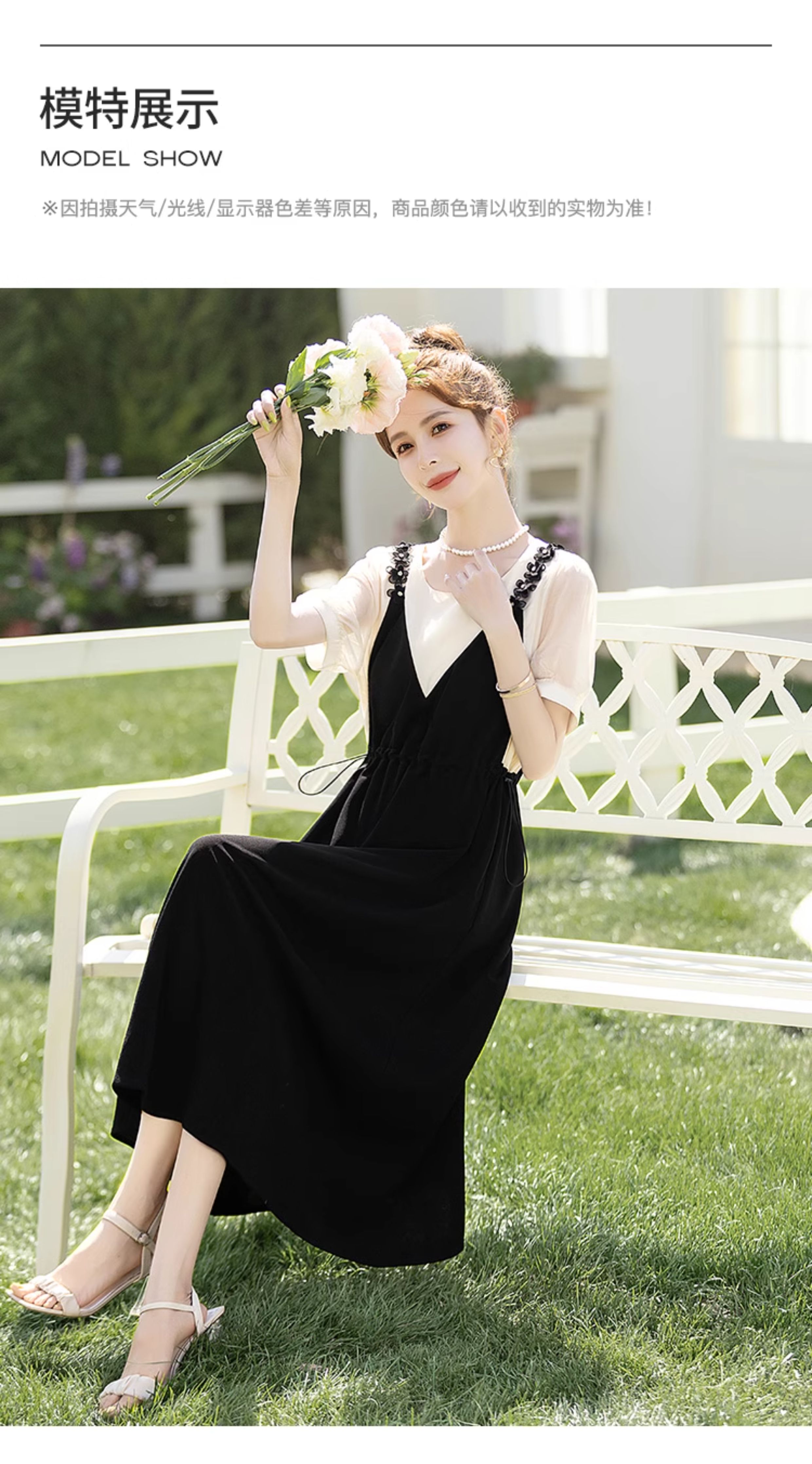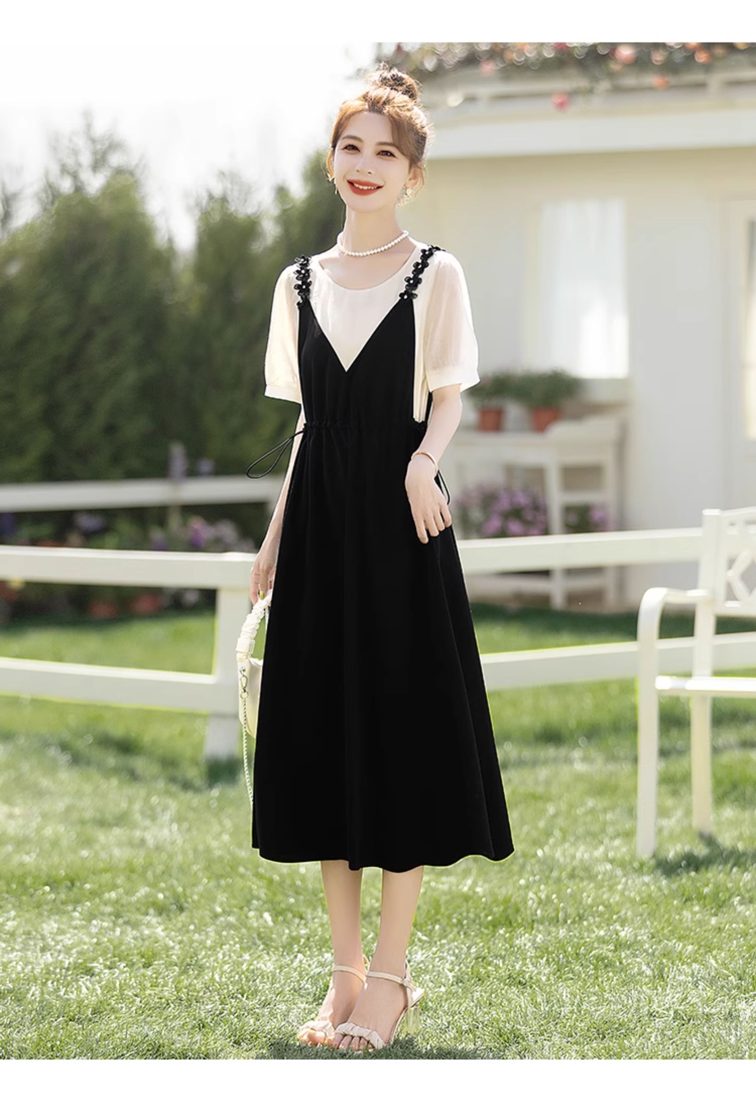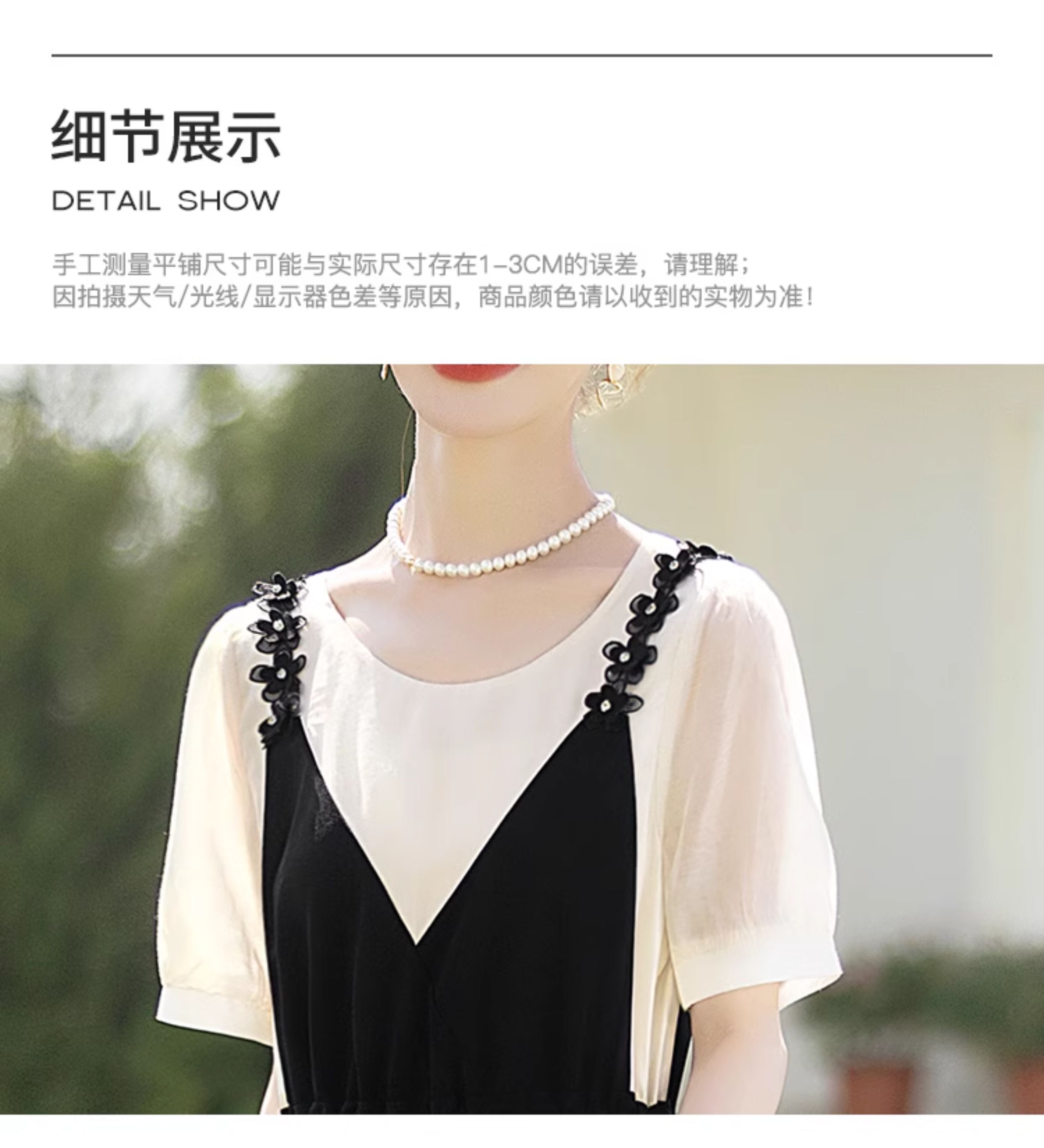 丝柏舍假两件连衣裙2025夏装新款女装圆领短袖撞色中长款A字裙