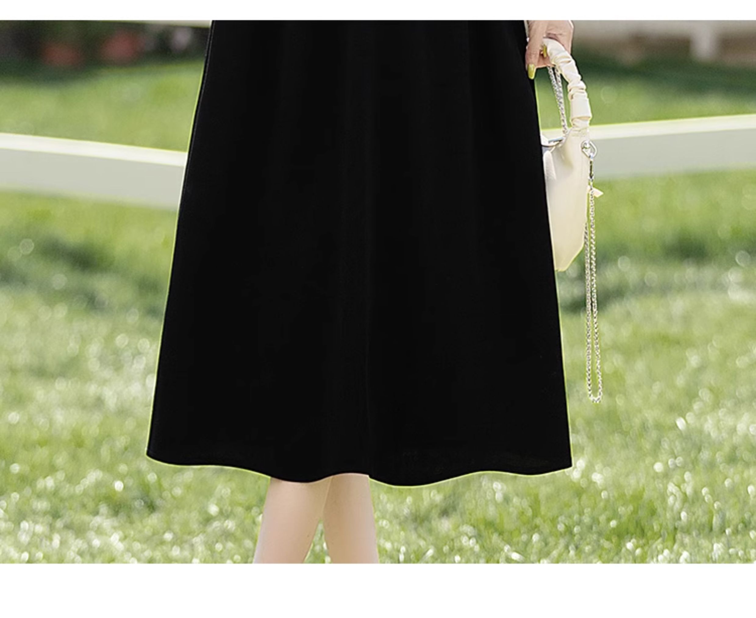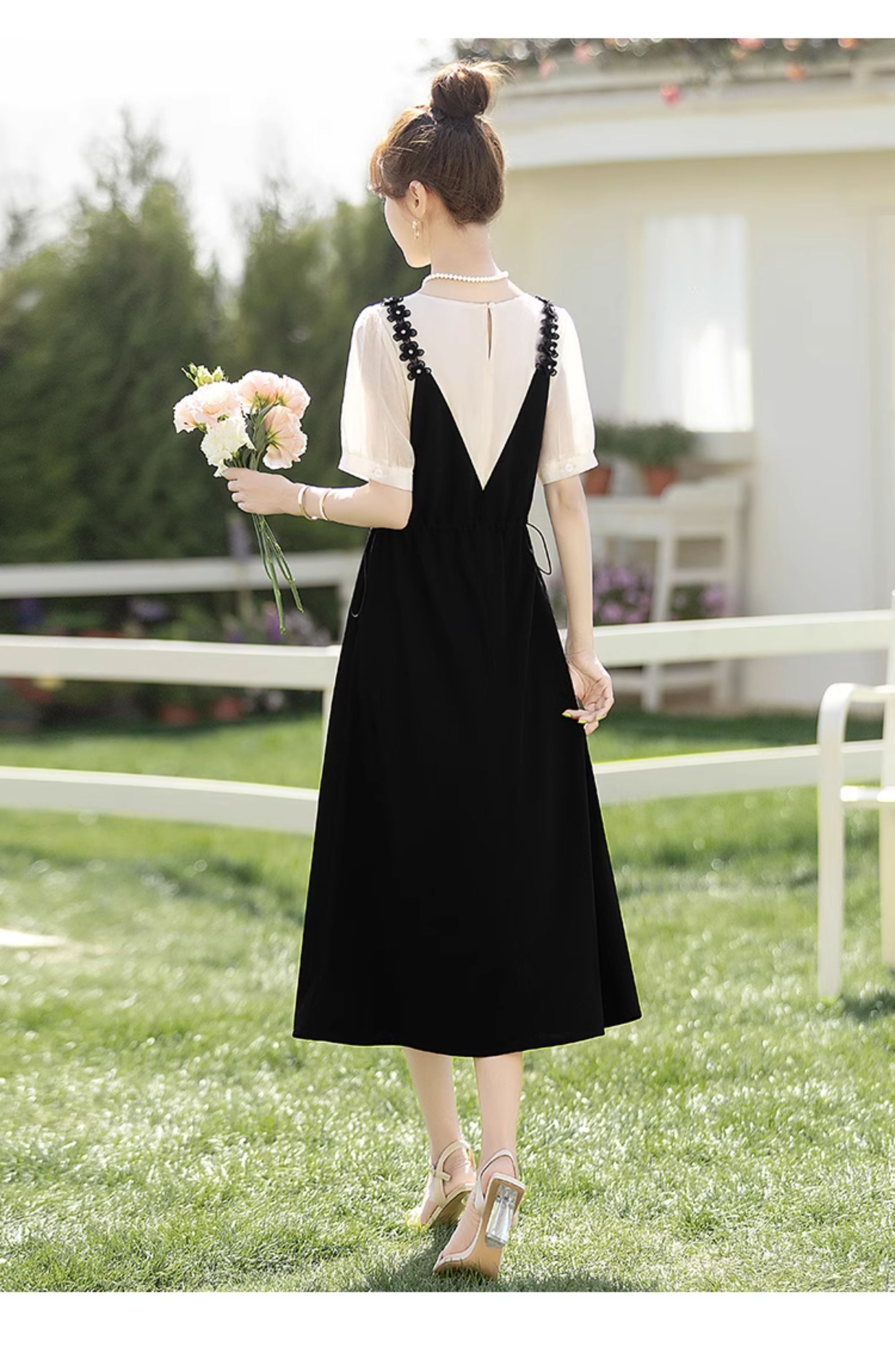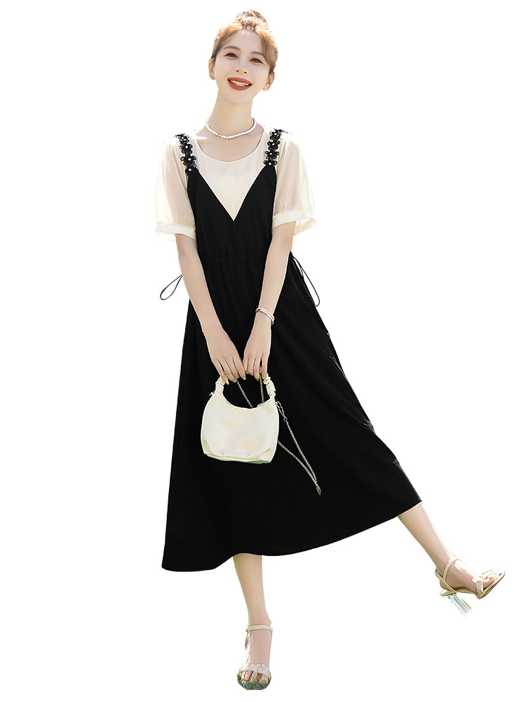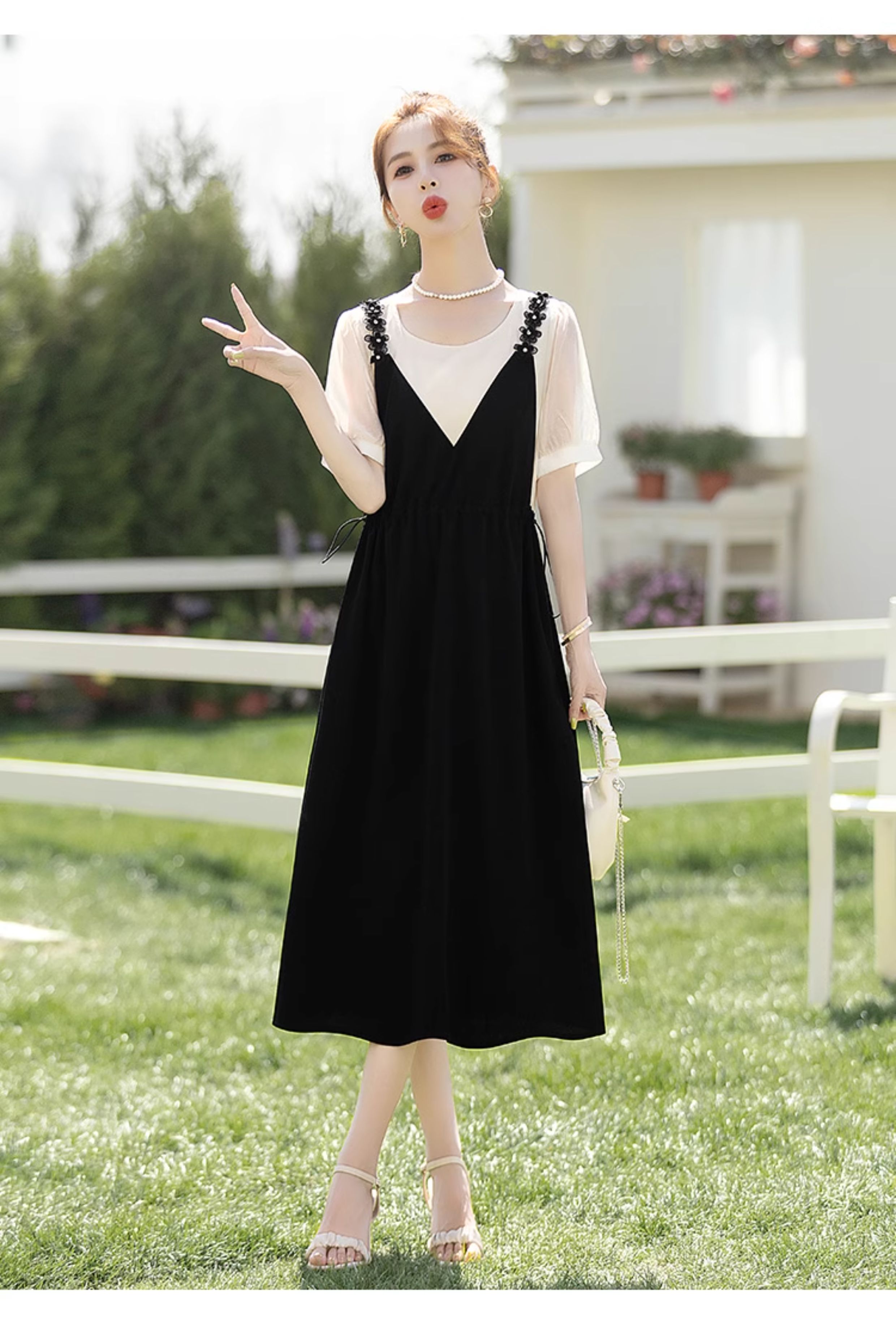 丝柏舍假两件连衣裙2025夏装新款女装圆领短袖撞色中长款A字裙